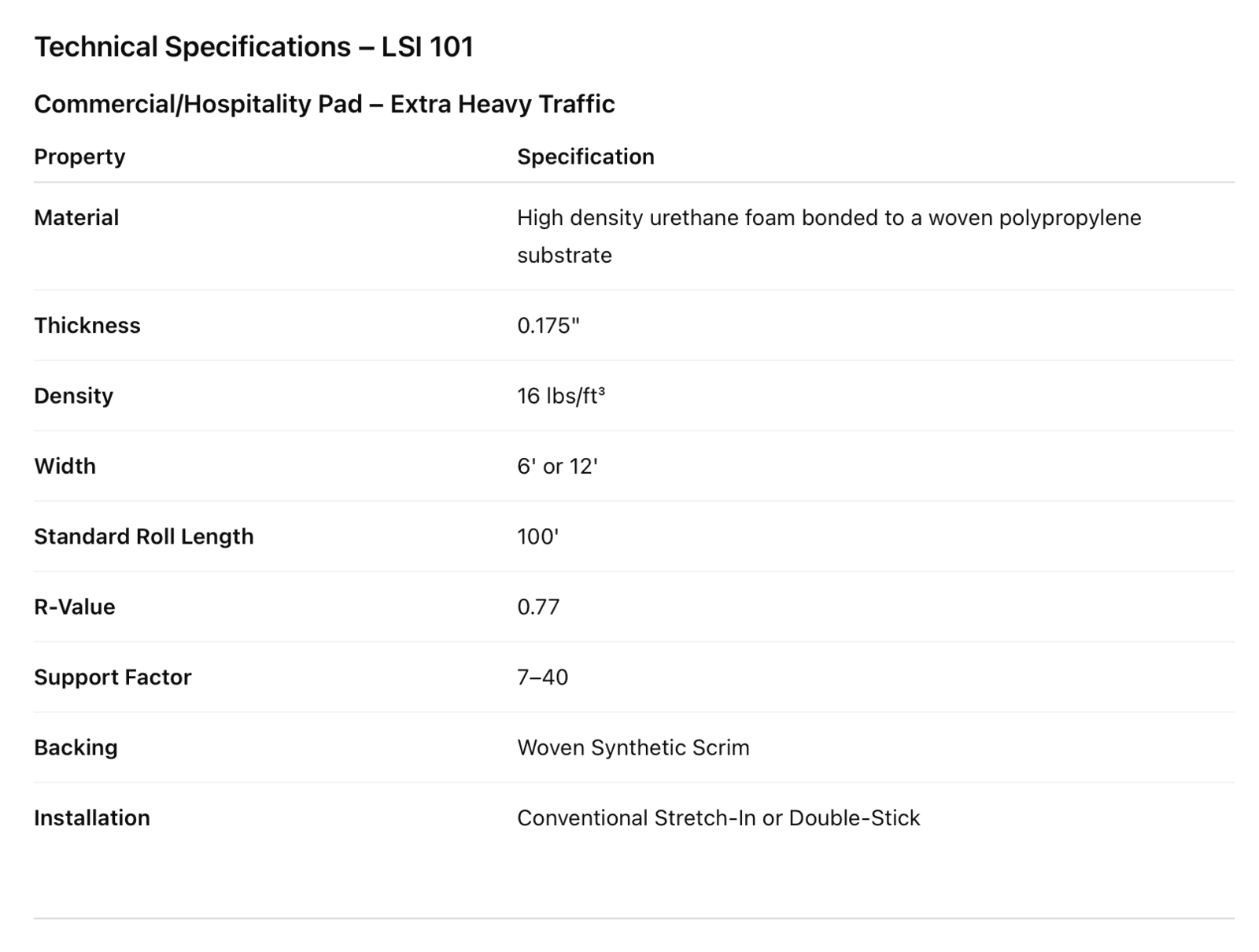 First developed in 1984, LSI 101 is part of our UnSquashable™ collection of high-density urethane cushions. Its tightly packed cell structure delivers superior resiliency, resists flattening, improves acoustics, and extends the life of carpet installations. LSI 101 is also well-suited for environments with rolling chairs and carts, maintaining performance even under continuous movement.