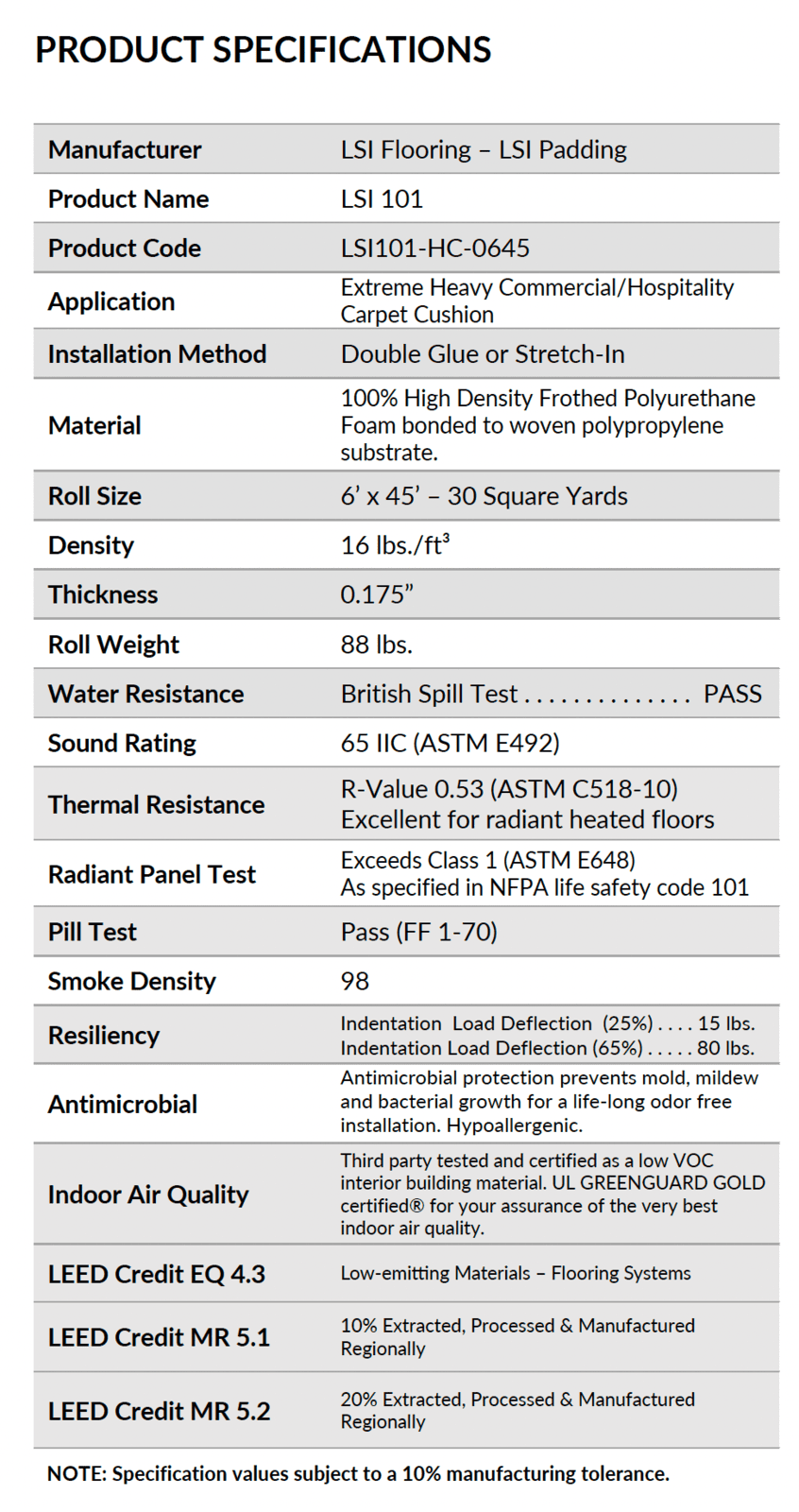 LSI 101 Commercial Carpet Cushion is warranted forperformance equal to the life of the carpet wheninstalled using recommended commercial installationmethods.