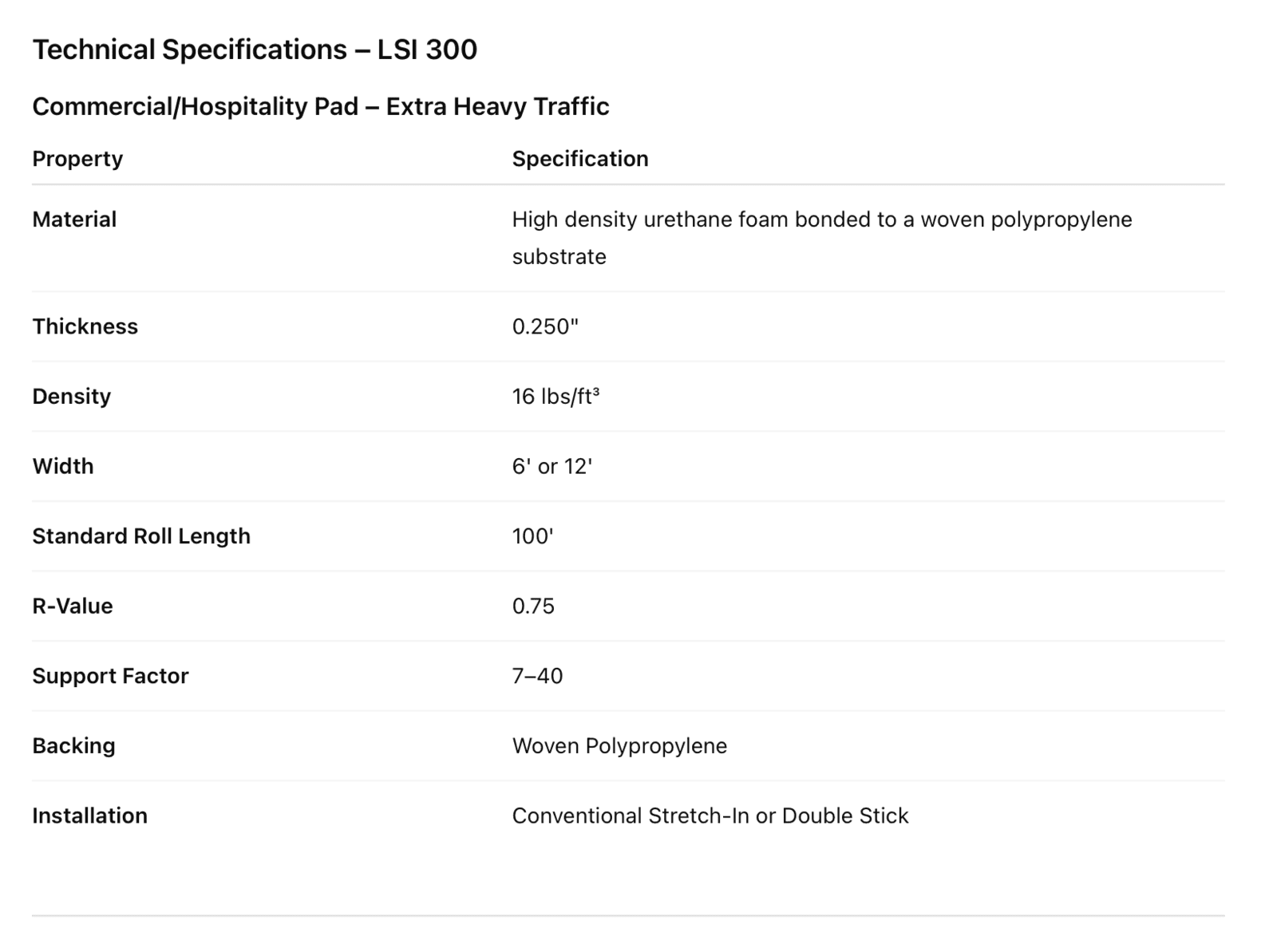 LSI 300 is part of our UnSquashable™ urethane cushion collection, designed for extra heavy duty performance where durability and comfort are both essential. With increased thickness compared to LSI 101, it provides superior underfoot feel, excellent acoustics, and resistance to bottoming out.