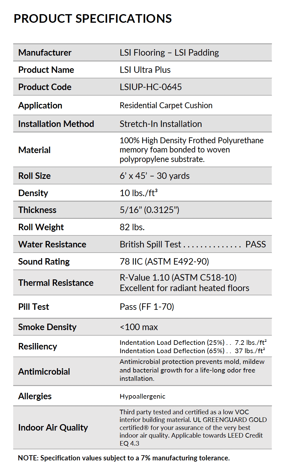 LSI Ultra Plus represents the pinnacle of urethane cushion innovation. Developed with proprietary chemistry and manufacturing techniques, it delivers unmatched density, comfort, and durability. Designed for ultimate luxury comfort. Ultra Plus II ensures carpets maintain their beauty and performance over time.