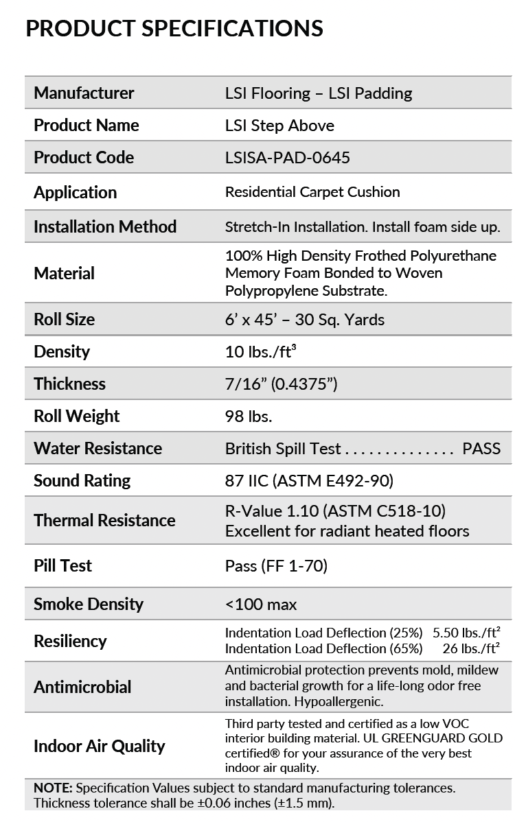LSI Step Above is a thicker more luxurious residential carpet cushion engineered to deliver superior comfort, resilience, and long term carpet performance.